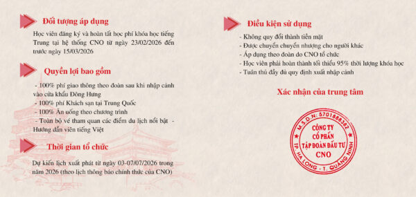 Mừng xuân Bính Ngọ và Quốc tế Phụ nữ 8/3, Công ty cổ phần tập đoàn Đầu tư CNO thông báo tất cả các cơ sở đồng loạt triển khai chương trình ưu đãi đặc biệt dành cho học viên “Đăng ký khóa học – Tặng du lịch Trung Quốc”