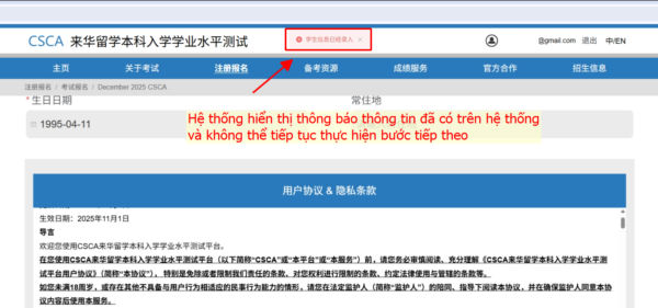 Ngoài ra có trường hợp đang đăng ký dở bước điền thông tin cá nhân thì không thể chuyển qua bước lựa chọn Môn thi, sau đó hệ thống hiển thị thông báo dữ liệu người dùng đã tồn tại