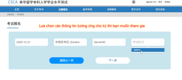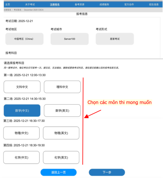 Tiếp theo bạn cần lựa chọn các thông tin cho kỳ thi CSCA