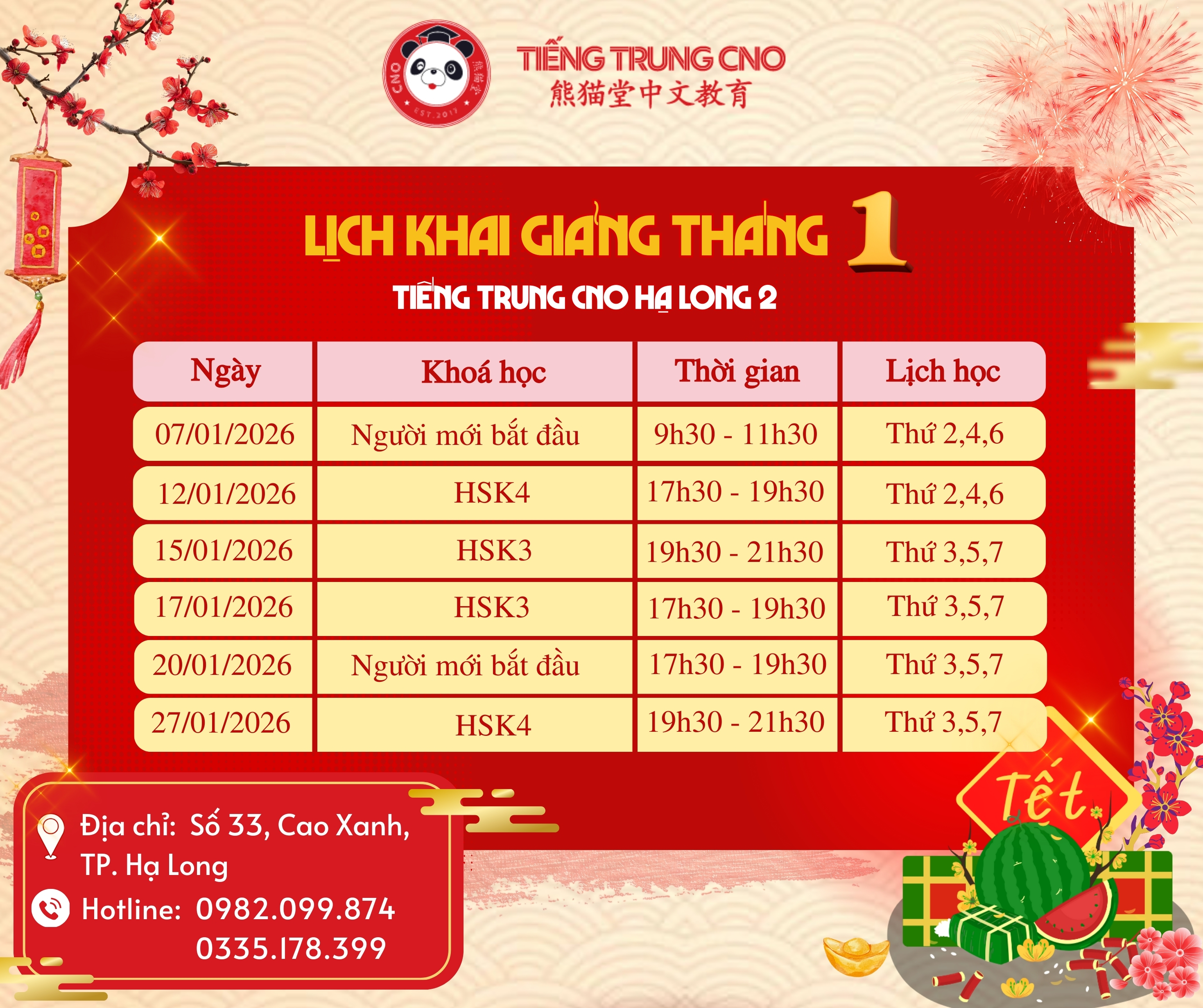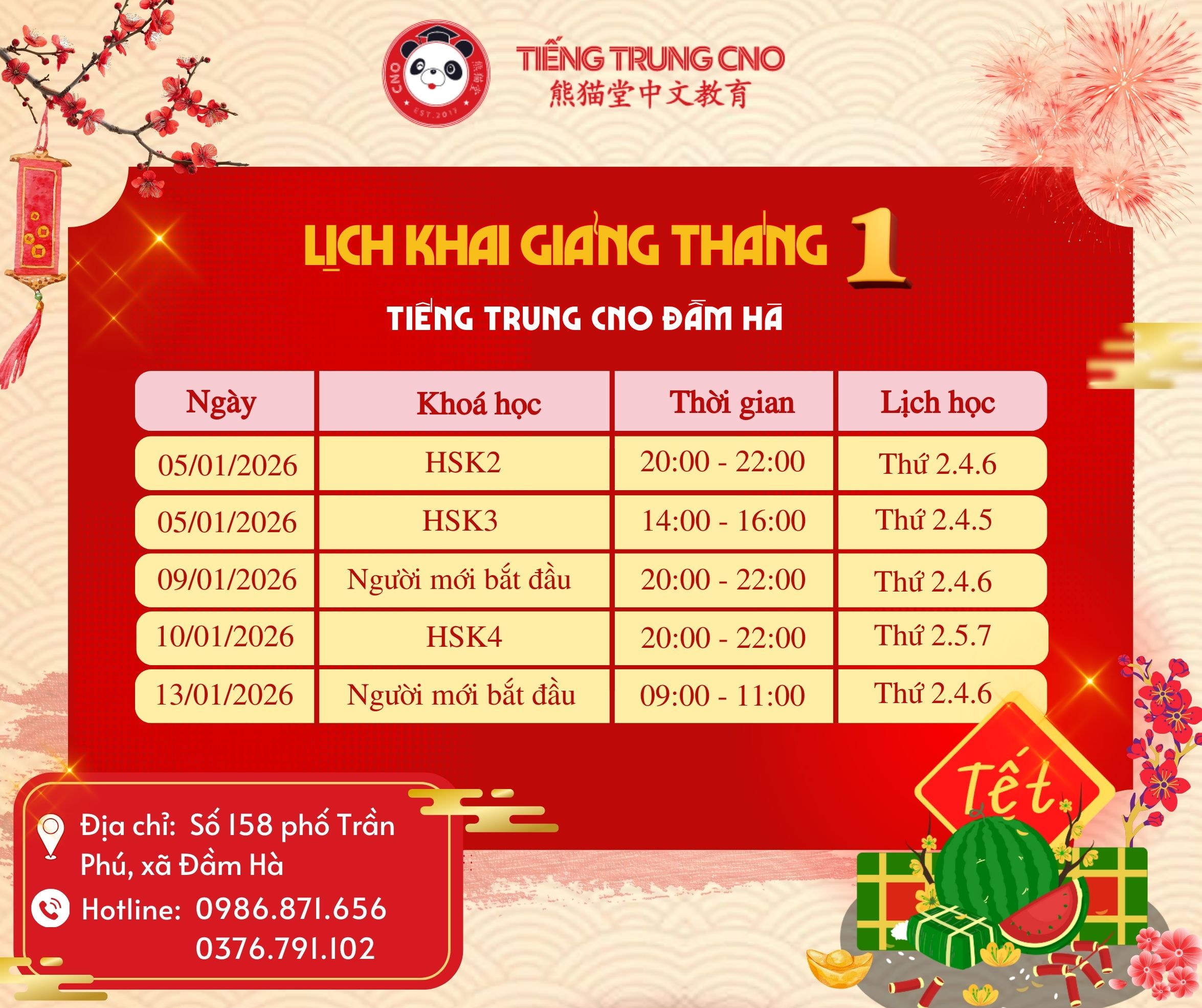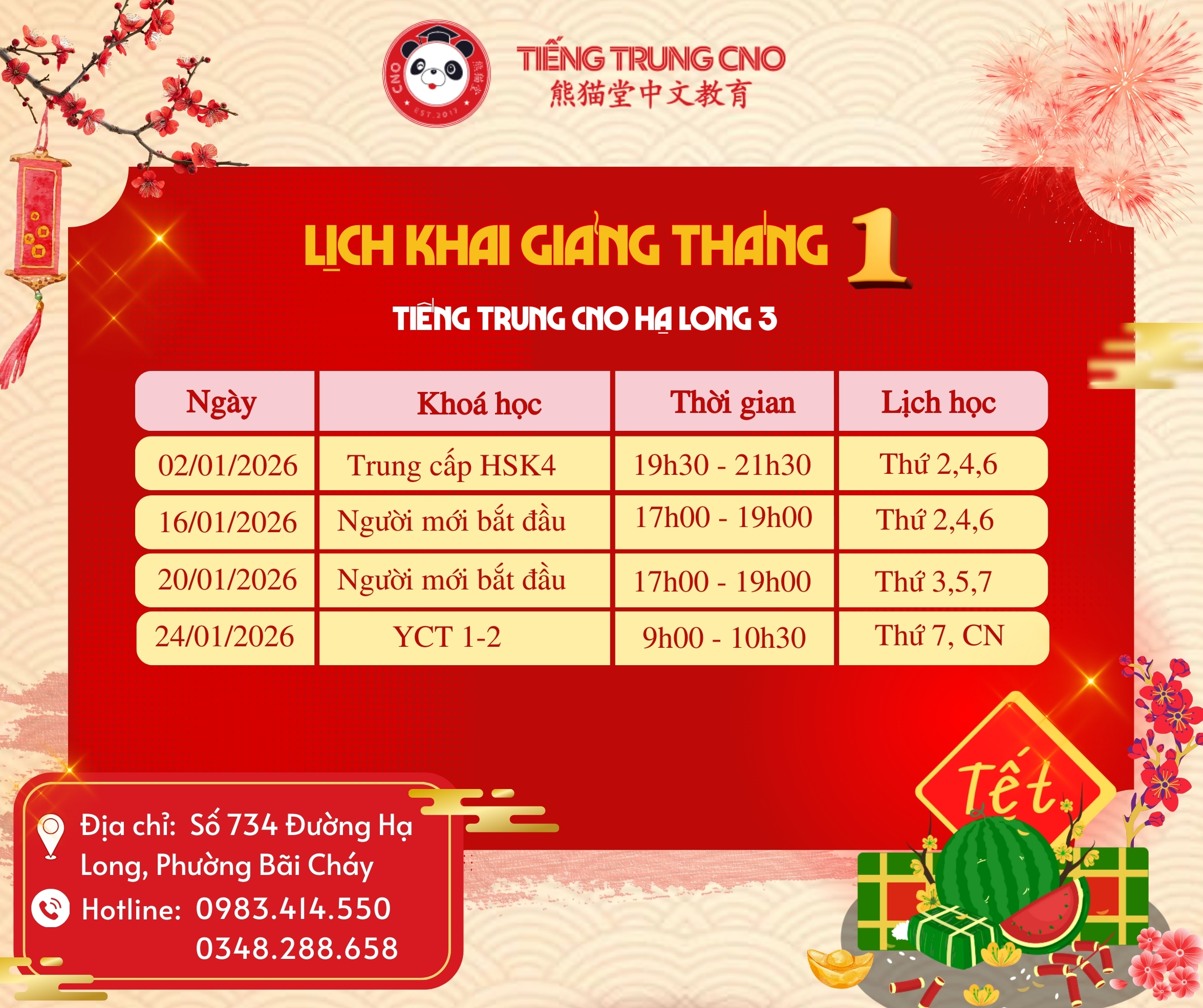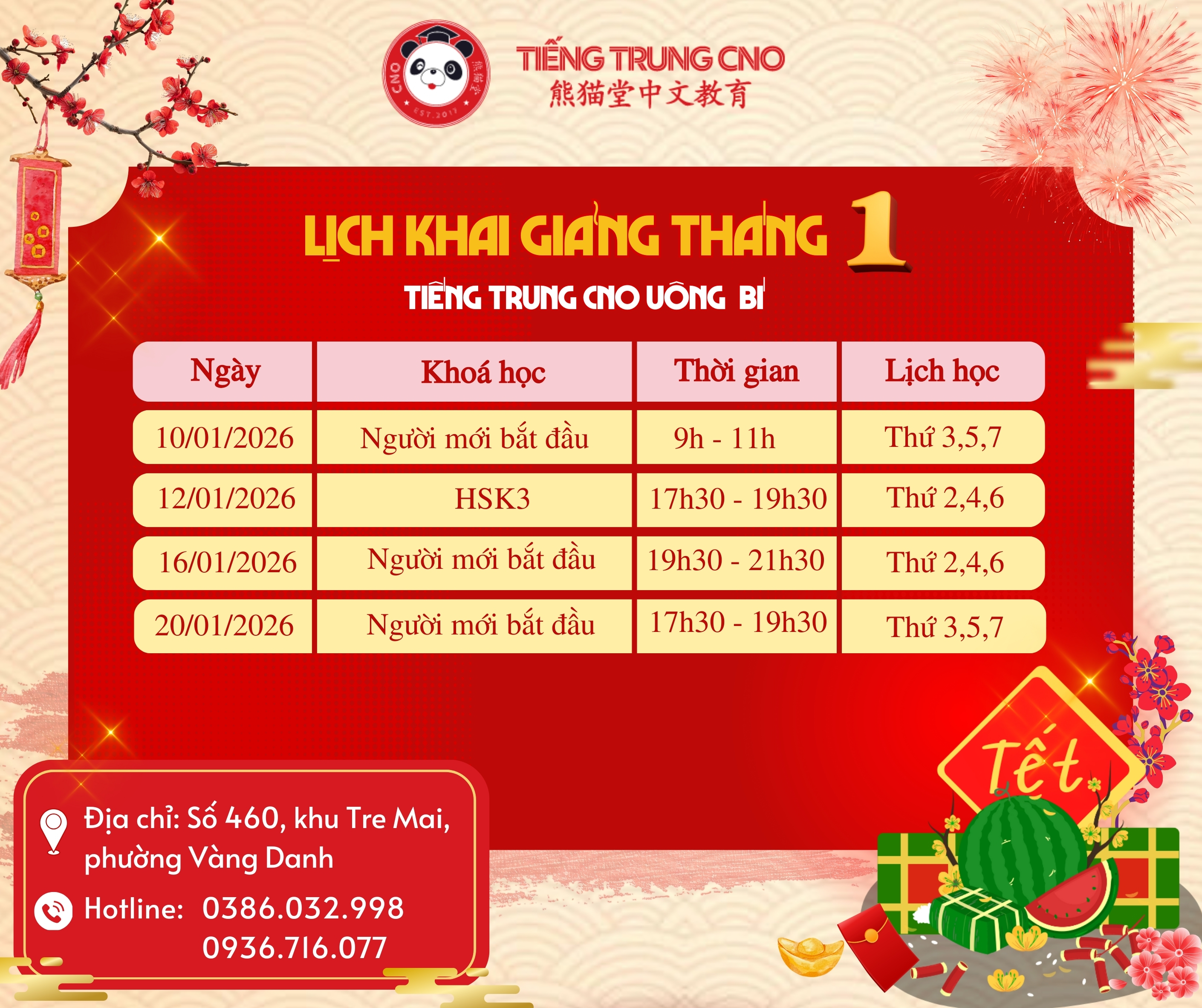 LỊCH KHAI GIẢNG TIẾNG TRUNG CNO ĐẦU NĂM 2026 – ƯU ĐÃI NHẬN LÌ XÌ LÊN ĐẾN 2 TRIỆU ĐỒNG