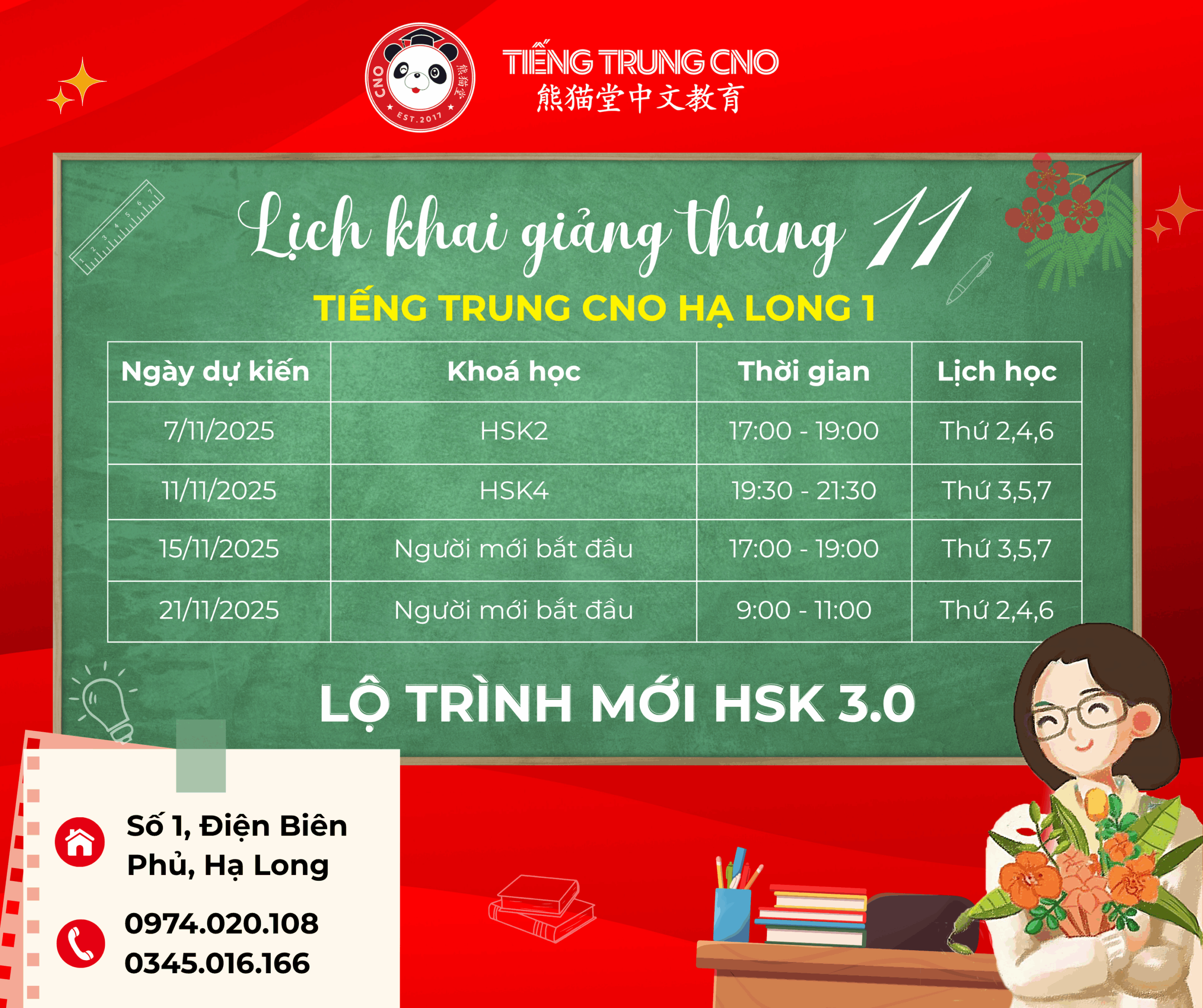 TIẾNG TRUNG CNO Hạ Long 1 thông báo lịch khai giảng các lớp TIẾNG TRUNG Tháng 5/2025. Lộ trình học THIẾT KẾ RIÊNG cho từng độ tuổi và trình độ...