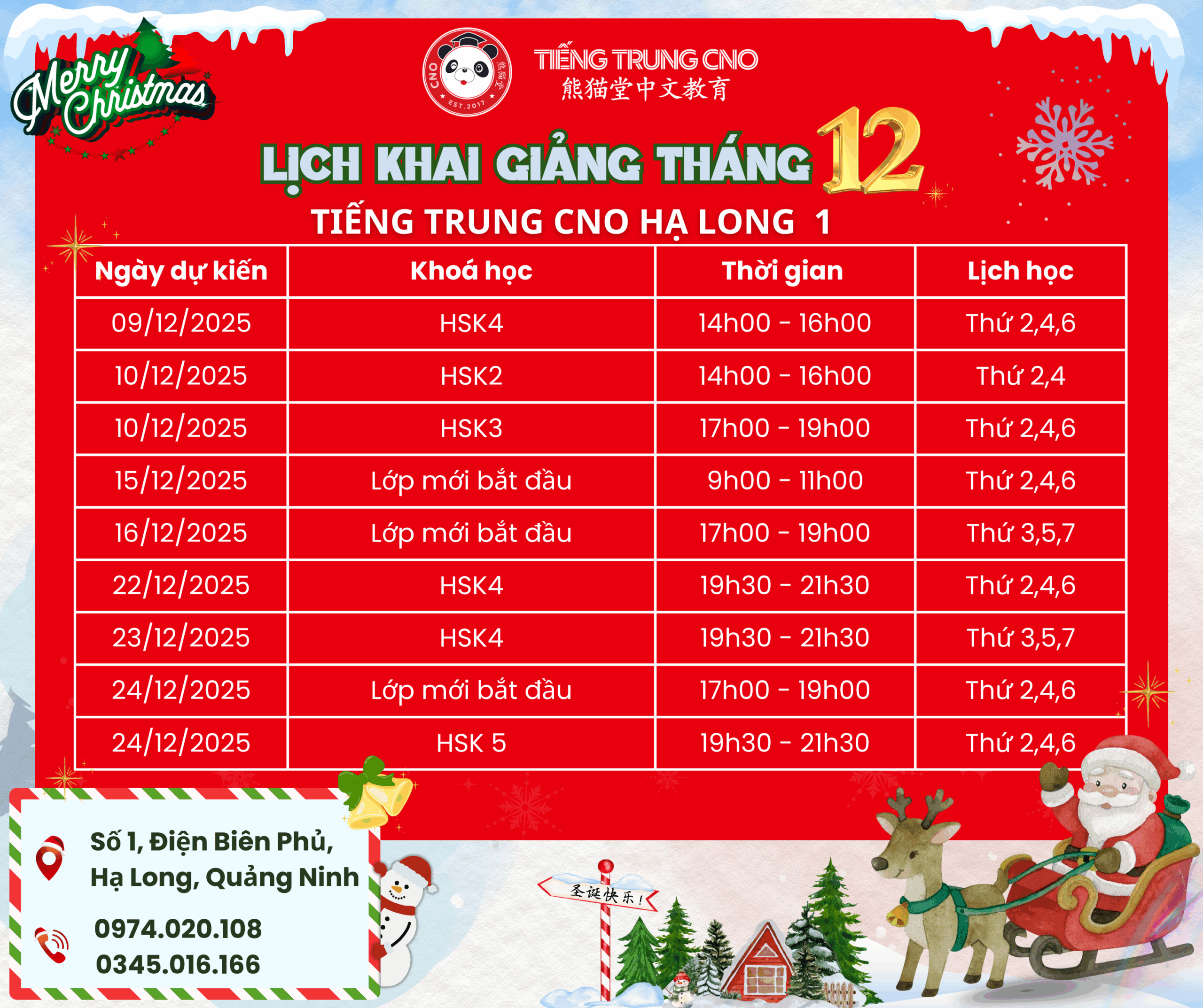 LỊCH KHAI GIẢNG THÁNG 12 – TIẾNG TRUNG CNO