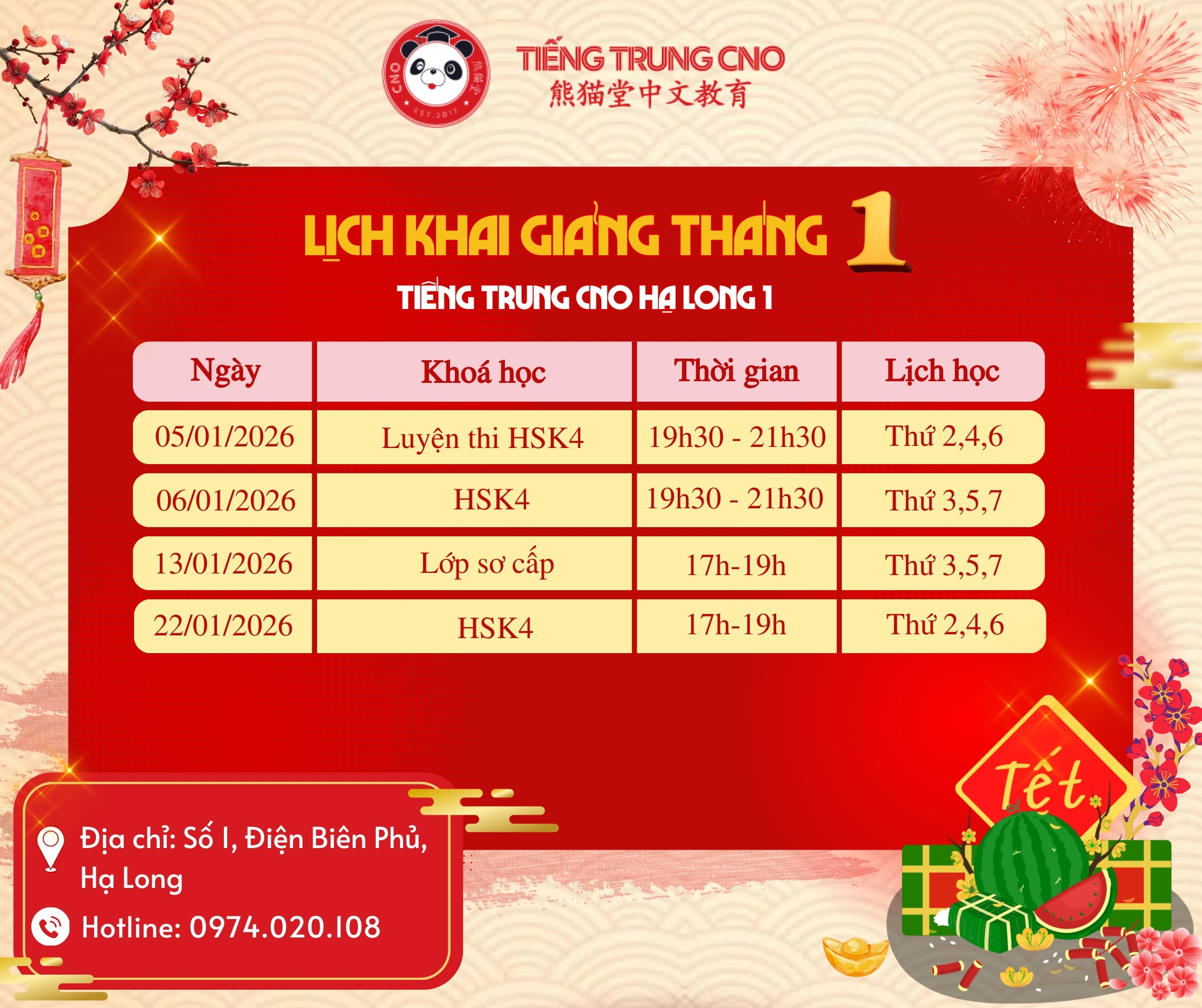 🇨🇳 LỊCH KHAI GIẢNG THÁNG 1 – CƠ SỞ HẠ LONG 1📍 Địa chỉ: Số 01 Điện Biên Phủ, Hồng Hà, Hạ Long 🌟 Khởi đầu năm mới – Cùng...
